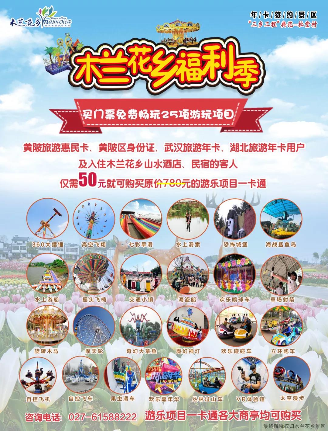 賞完花海,縱情游樂 木蘭花鄉(xiāng)福利季震撼來襲 買門票免費暢玩25項游樂項目 黃陂惠民卡(身份證)、武漢賞花游惠民活動預約用戶、湖北及大武漢年卡用戶 僅需50元,就可暢玩 價值780元的25項游樂項目