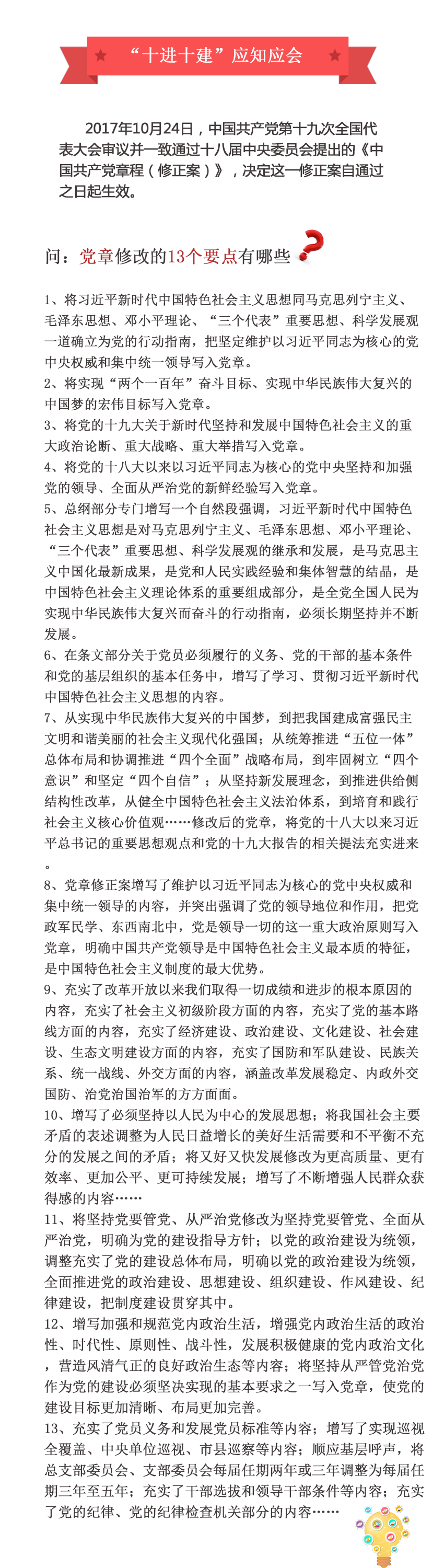 什么是“十進(jìn)十建”? 一是進(jìn)黨委(黨組)工作議程和中心組學(xué)習(xí)安排,建立健全日常工作和學(xué)習(xí)制度; 二是進(jìn)黨政機(jī)關(guān)日常工作和學(xué)習(xí)安排,建立健全機(jī)關(guān)紀(jì)委和紀(jì)檢員日常...2018-10-12